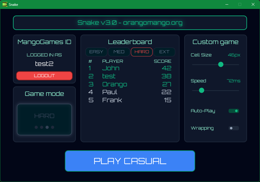 - Custom Games: Pick your own snake speed and board size for a casual match.